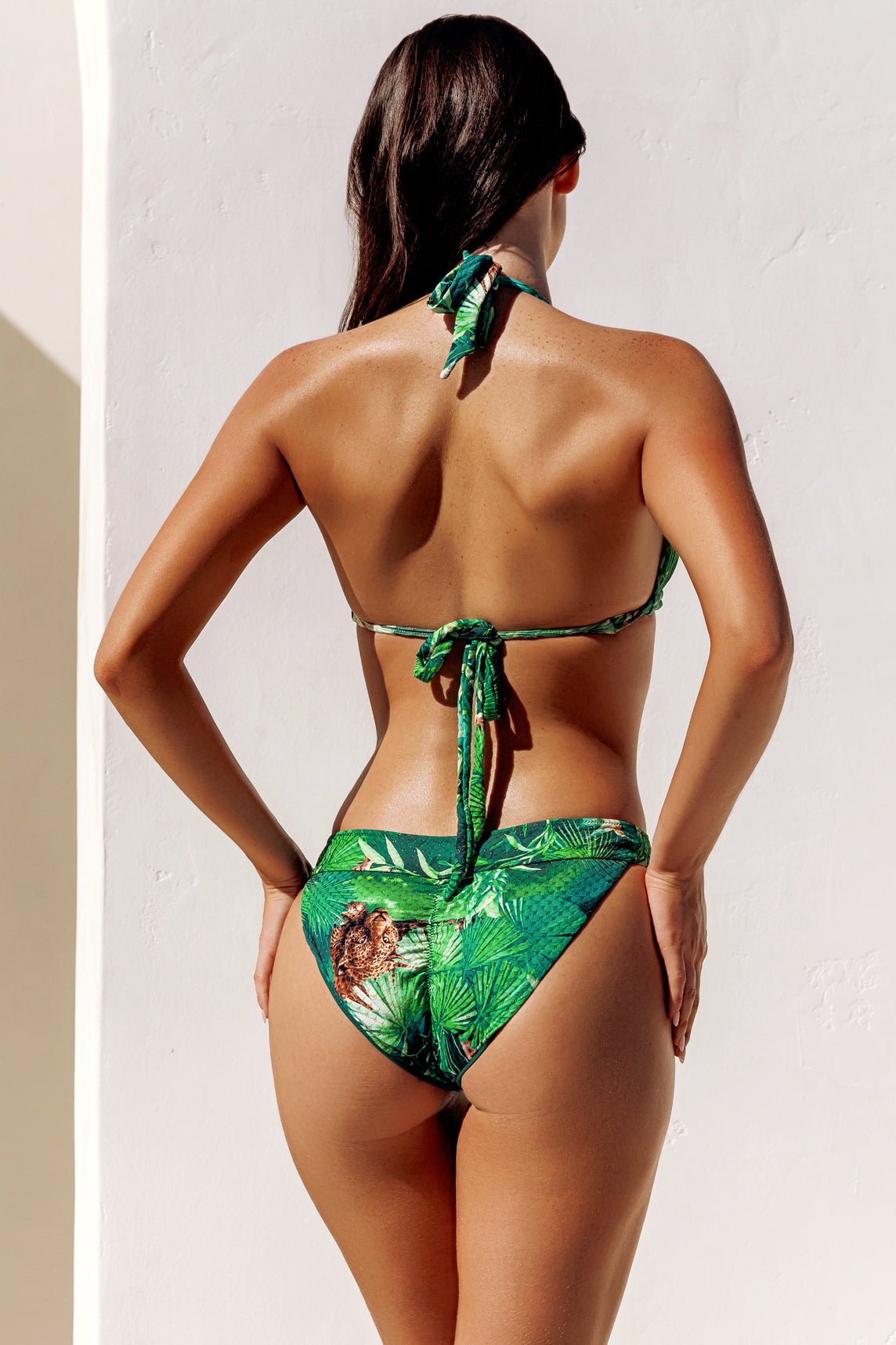 Channel the untamed energy of the Amazon in this jungle print bikini set. This trend-setting green bikini set features a jungle-inspired print fabric woven with gold Lurex for a subtle shimmer. The double band top and full-coverage scrunch bottoms contour and define in all the right places. The Amazon Full is vibrant, daring and made for your next sunny day adventure.