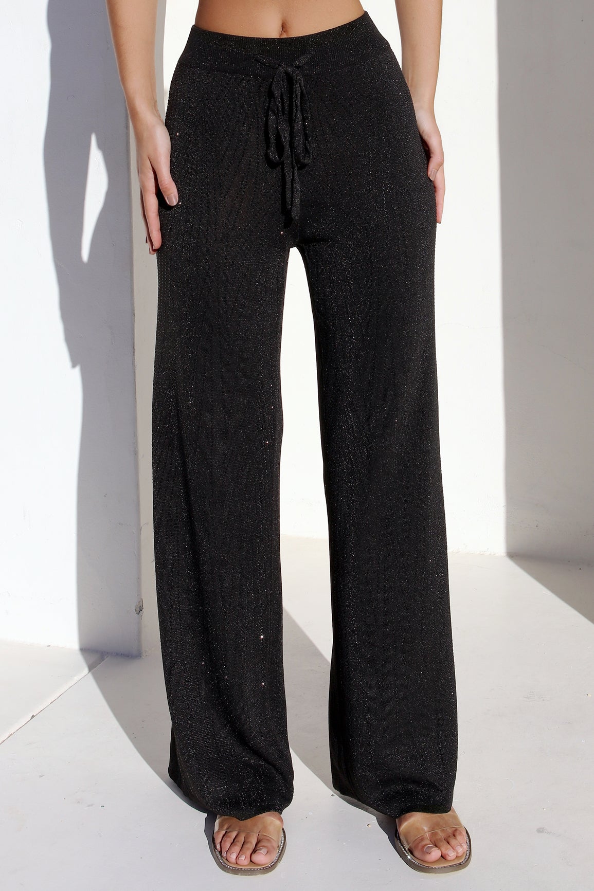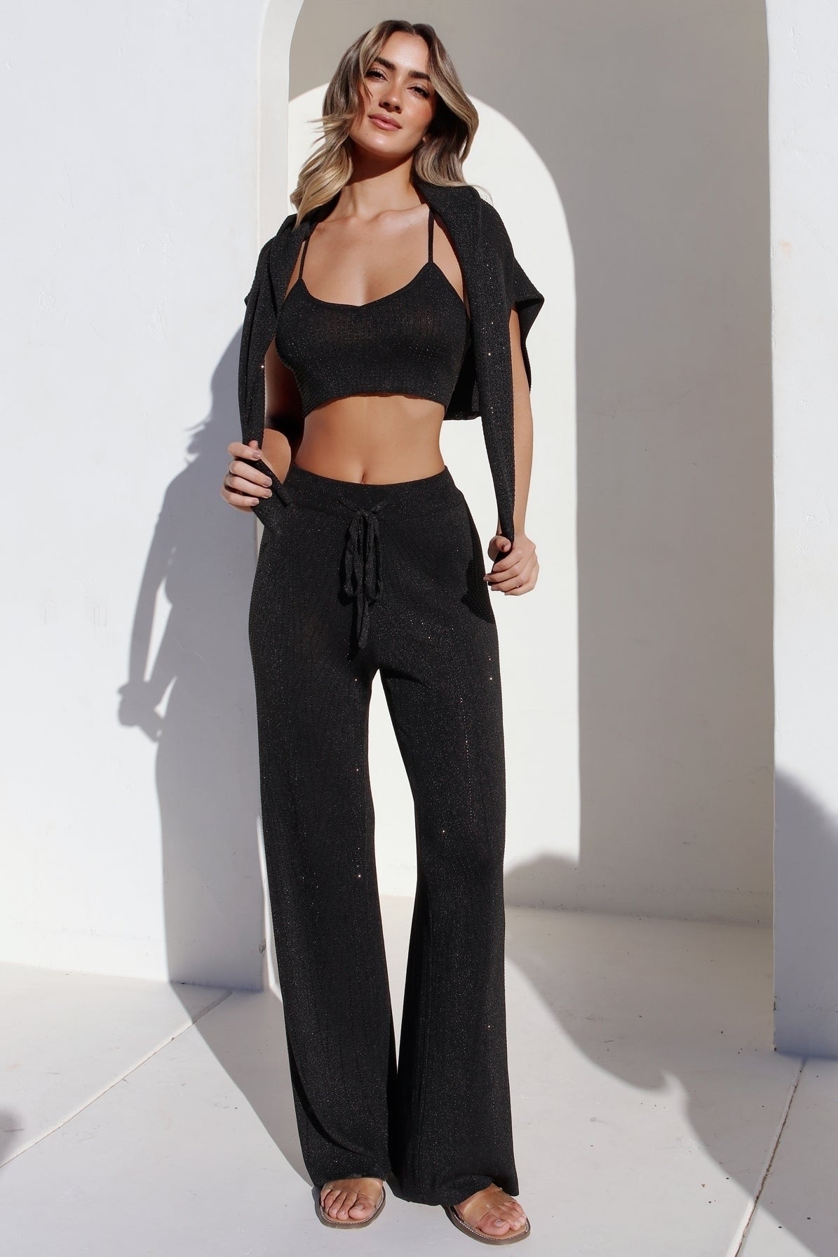 Elevate your everyday wardrobe with the Onyx Crystallized Flare Pants, part of the ultimate crystallized knit separates for effortless styling. These black flare pants feature a flattering silhouette that elongates your legs in all the right places. Made from lightweight lurex knit fabric with a crystal-patterned front and an adjustable drawstring waistband for all-day comfort. Pair them with our matching crop tank or long sleeve top for a chic, coordinated look that keeps you feeling stylish and fabulous every step of the way.