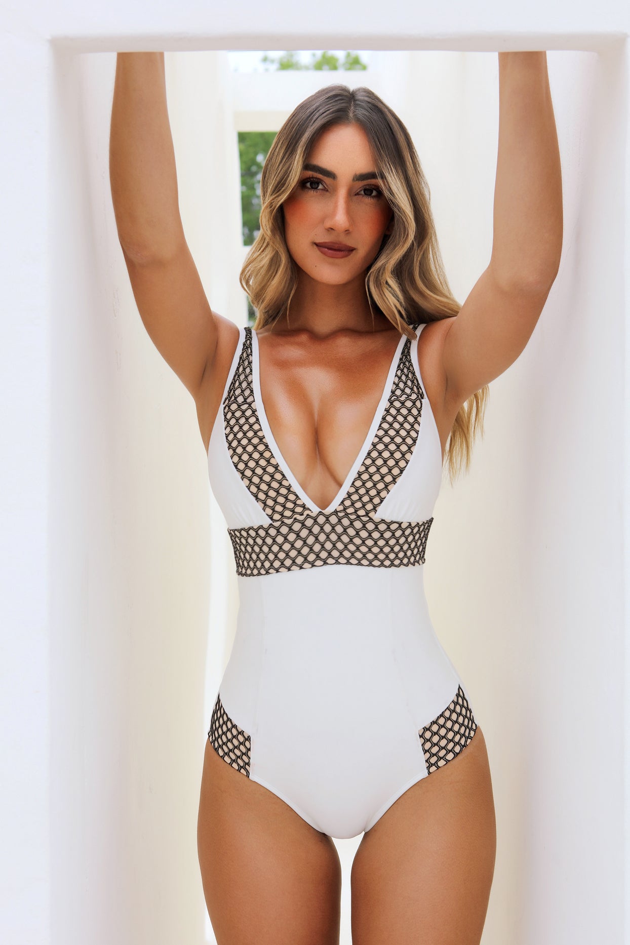 This is not your average one-piece swimsuit. This Luxe-White Mesh One Piece is crafted from luxury fabric and lined with power mesh for a smooth, supportive fit that sculpts and contours the body. Designed to flatter from every angle, it offers confident support through the bust and waist, while a corset-back detail allows for an adjustable, cinched silhouette. Polished, powerful, and timeless, this one-piece is a bold and luxe addition to your swimwear wardrobe.